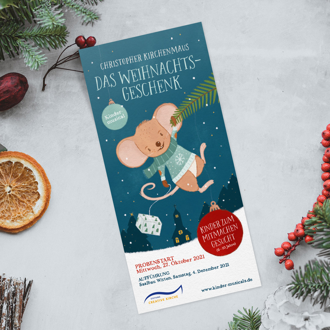 Für ein Kindermusical in der Weihnachtszeit durfte ich die kleine Christopher Kirchenmaus illustrieren und einen passenden Flyer dazu gestalten.